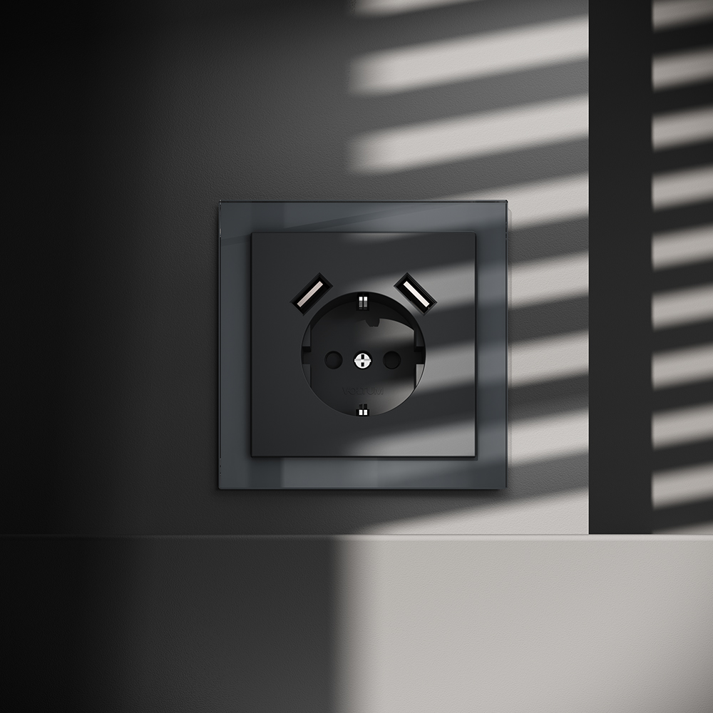 Розетка встраиваемая Voltum S70 с заземлением, шторками и USB A+A Графит VLS040407